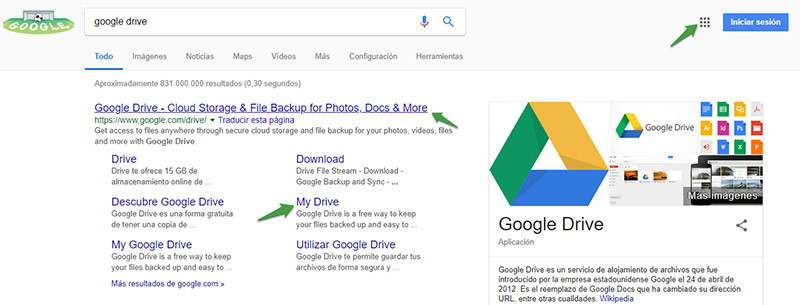 A través de un buscador. Si lo haces desde Chrome, verás un pequeño cuadrado a mano derecha, al lado del botón «Iniciar sesión». Una vez hagas clic en el botón, encontrarás todas las aplicaciones de Google (Youtube, Forms, Blog,…).Haz clic en “Drive” y accederás a la interfaz de la aplicación.